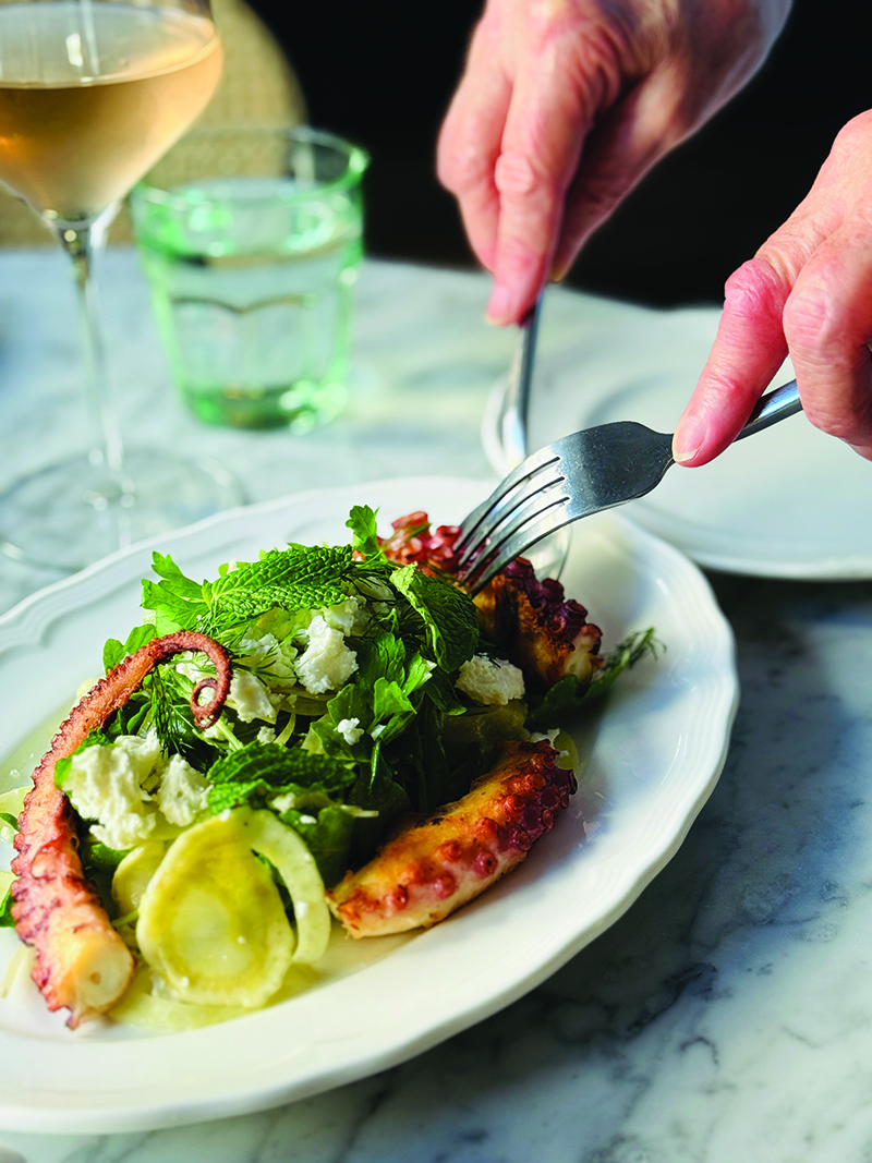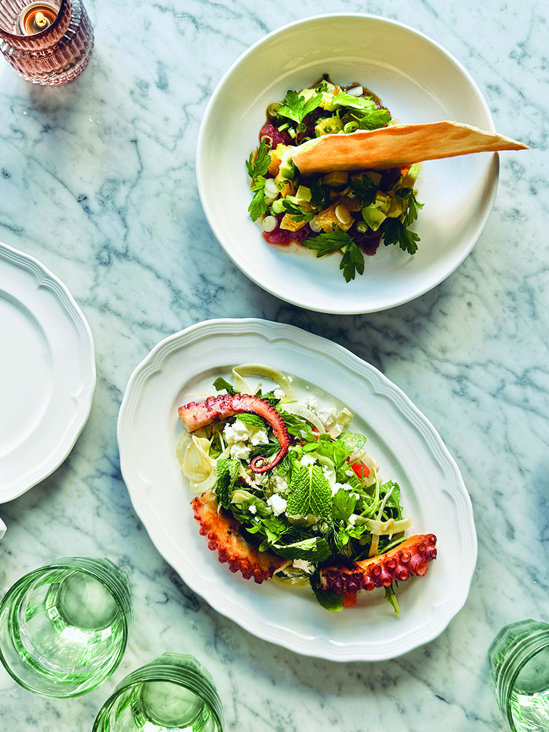 Antipasti reminiscent of an Italian seaside restaurant: octopus with watermelon, fennel, feta and herbs, and tuna tartare with avocado and orange.