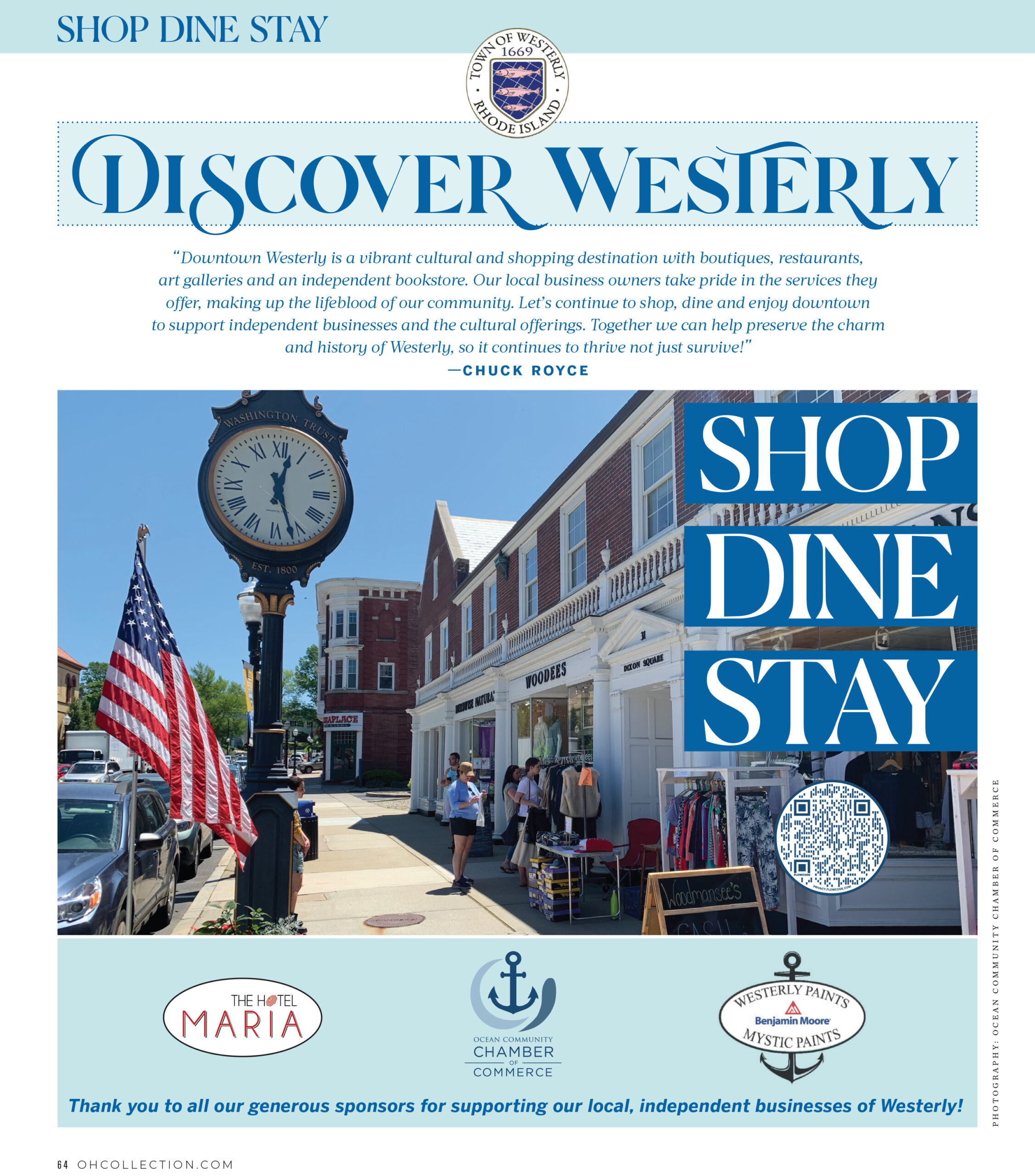 Thanks to your generous sponsors, The Hotel Maria, and Westerly Paints & Mystic Paints and media sponsors Ocean Community Chamber of Commerce, we’ve put together a Discover Westerly Guide to help you find what you’re looking for this season.