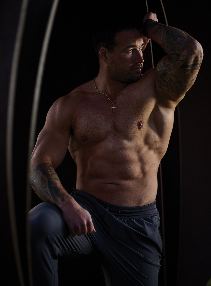 At his first bodybuilding show in 2015, Ambrogio neglected to work on his posing. “I got on stage and froze,” he recalls. “I have dyslexia and was on the wrong side of the stage. I got discombobulated and was nervous—in no shirt, with a ton of people watching, under the lights. It was a pretty traumatic experience!” He placed fifth anyway and says it was a great learning experience. A decade later, he’s looking very relaxed under our lights.