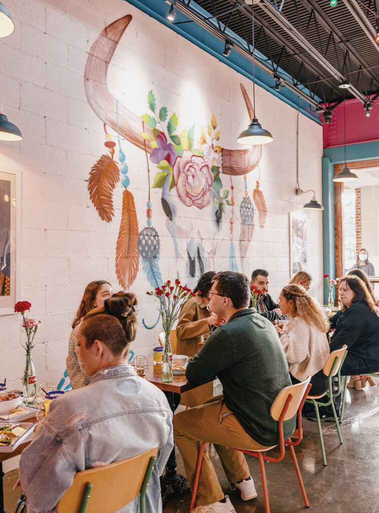 The colorful dining room elevates the upbeat atmosphere at Taco Project.