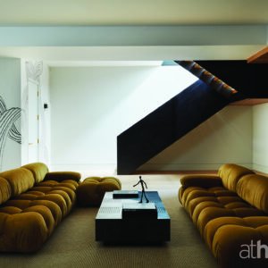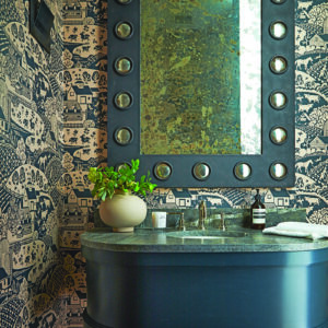 They had been deliberating about what they wanted to do with the stairwell. It was a big bone of contention, because no one could make a decision, and when I came in, I suggested opening it up and doing something in steel. They loved the idea. So, you’ve got this artful, really cool thing, and I think it was more effective than putting up glass rails. On the lower level, she was so receptive to the idea of doing this pattern on the walls. We were working with a Dutch company that makes murals to scale, and so we had to send them all the drawings of the space. The scariest part was pulling the trigger, because you’re doing everything a million miles away, hoping that it’s not lost in translation. They send you a sample at scale, then they show you the render around the space, and she said, “I’m in. I love it. That’s so fun.” So, you come down the steel staircase and then have the swirls all over the place, but it doesn’t give you vertigo. This space could’ve been basic, but now it’s such fun. It’s minimal but it’s maximal.