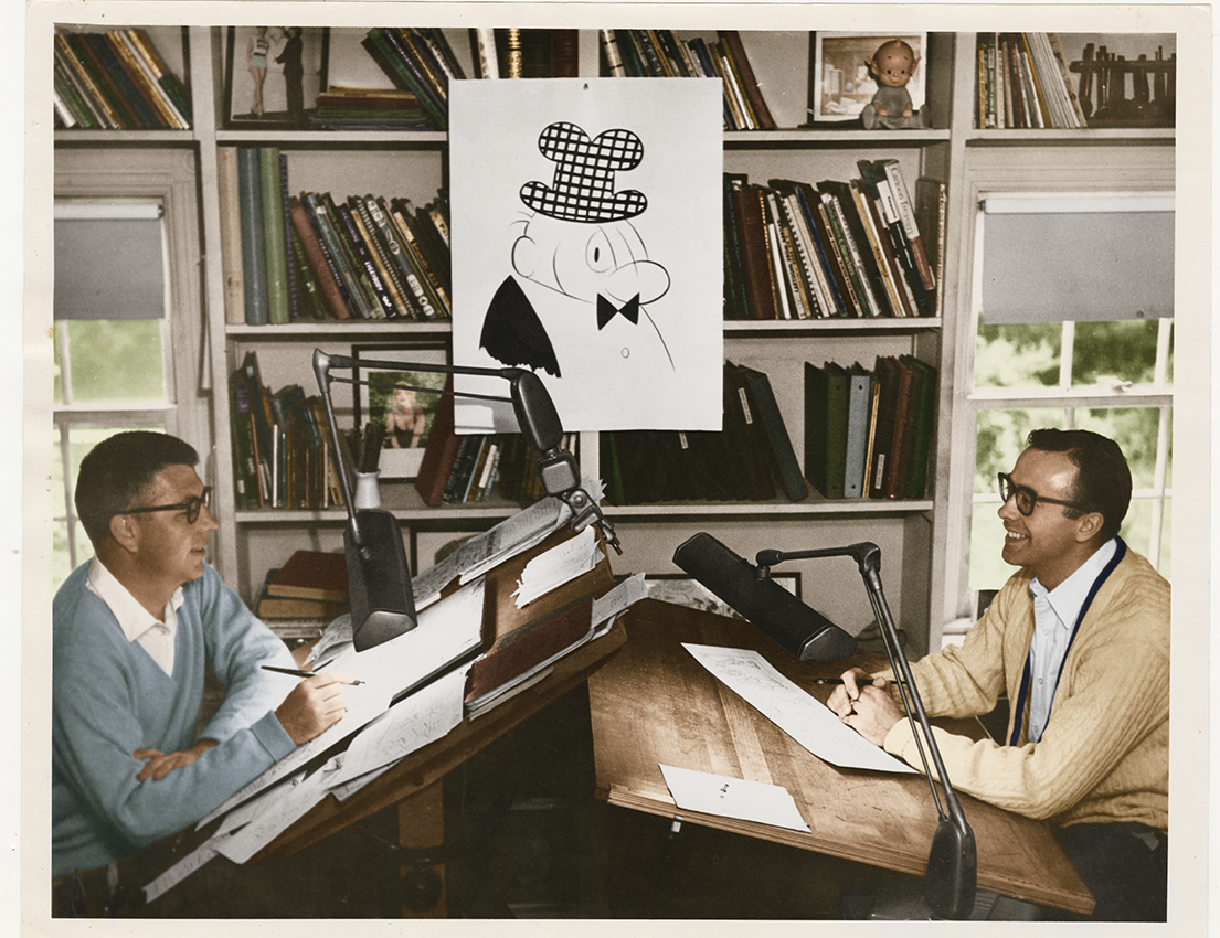 I picture Dad, a self-assured 26, fresh from the Air Force and Arizona State, dressed in chinos and a button-down short sleeve, his battered portfolio wedged under one arm. Mort, 33, came out to greet him. They shook hands in the middle of a flagstone path: not quite mirror images of each other, but, with their trim physiques, tidy haircuts and round cartoonists’ glasses, of a definite type. Then they repaired to the kitchen, where Dad untied the portfolio. Mort flipped through the pages for three or four minutes and said, “How soon can you start?”