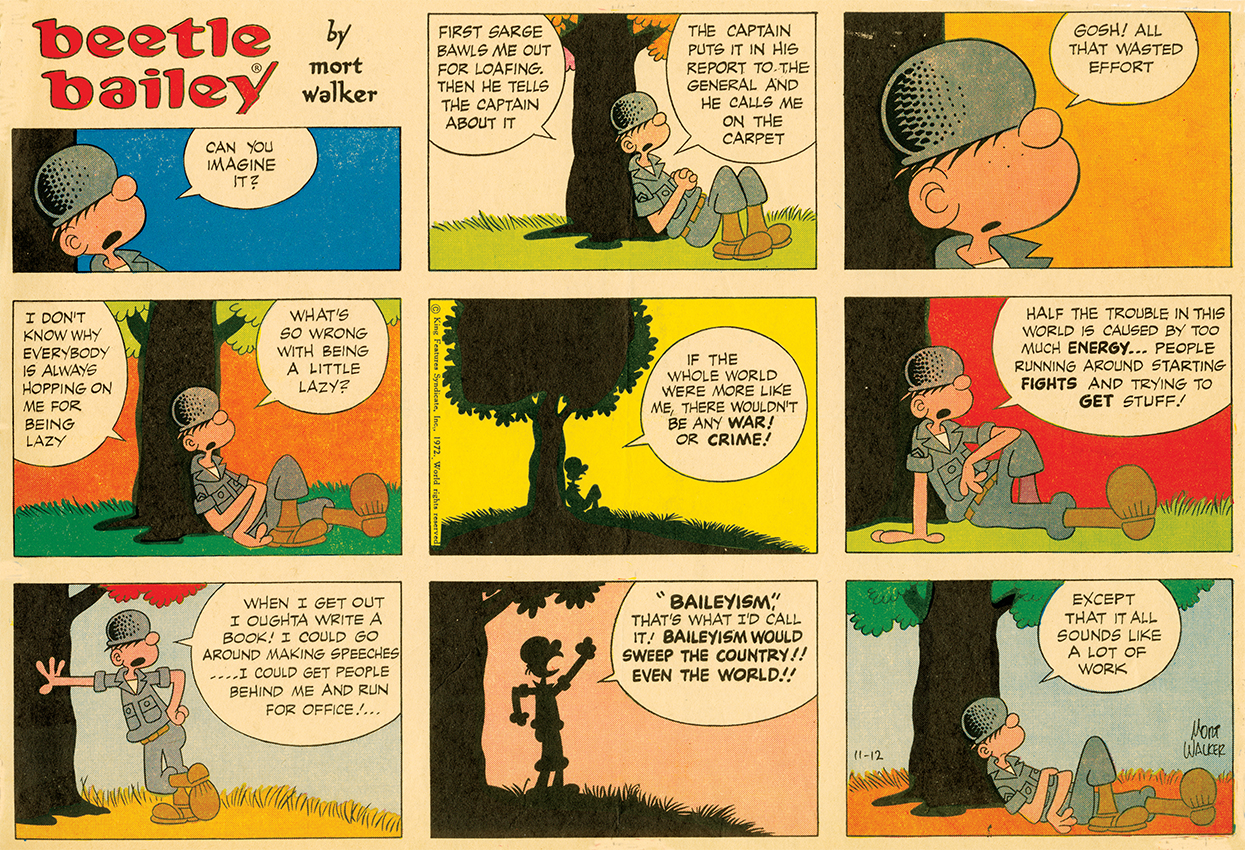 Mort Walker, on the other hand, had been a popular young man whose gifts were amply recognized. The caption below his high school yearbook photo would have made Charlie Brown groan with envy and disgust: “Absolutely TOP-NOTCH in everything.” Beetle, though less overtly autobiographical, reflects a happy-go-lucky, cheerfully rebellious, somewhat naughty author who seeks free will in a world that would fence him in. “Nobody likes to be told what to do—that’s the essence of Beetle Bailey, right?” Brian Walker observes. Mort himself once said of his characters, “They resist in order to exist.”