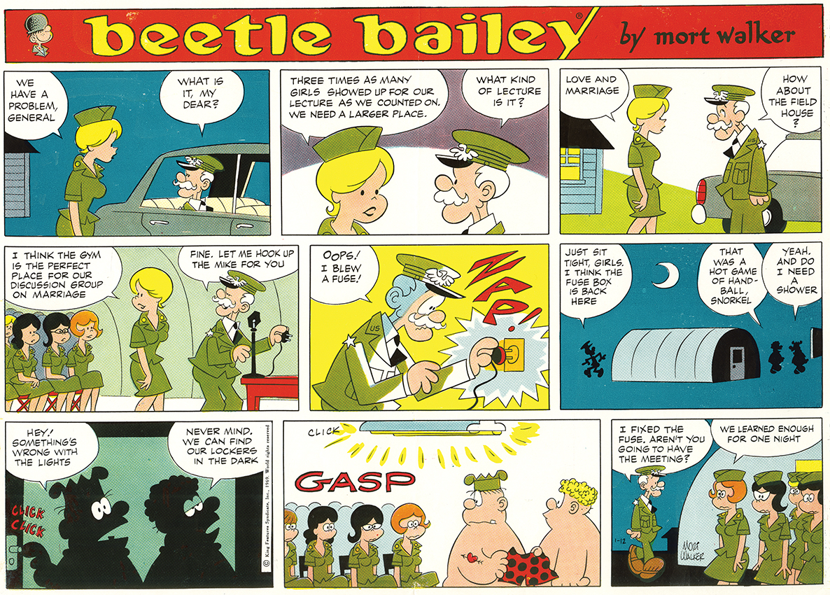 The Halftrack-Buxley gags were among Beetle Bailey’s best—and most controversial. Mort got letters like this: “Do you have a problem, Mr. Walker? Just because you have a penis doesn’t make you superior.” And this: “Have you taken leave of your senses? Get a job with a porn outfit.” “The biggest problem I’ve had in the past is sexism,” Mort once told me, a little wearily. “I tried to be careful. General Halftrack never propositioned her. But he did admire her and look at her. Older men never get tired of looking at pretty girls.”
