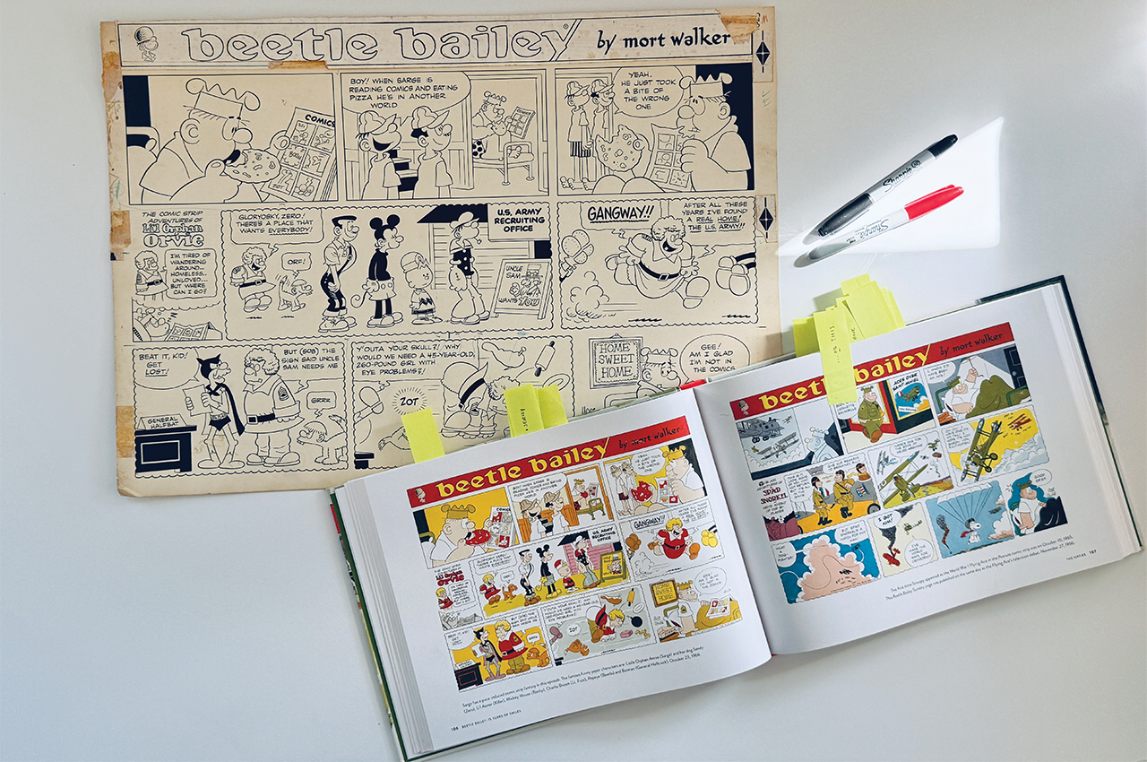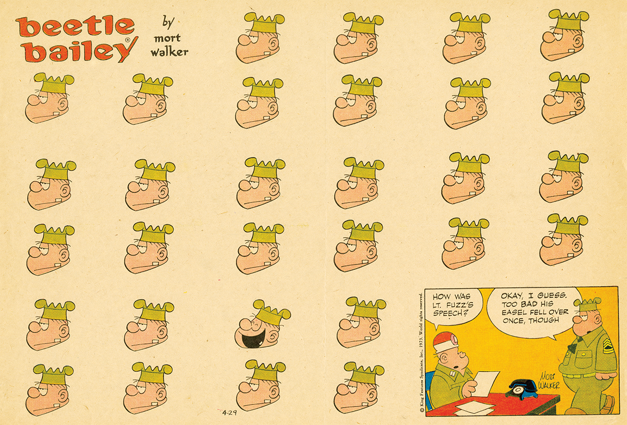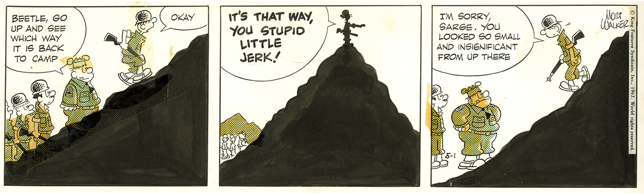 “Beetle is primarily a humor strip,” Brian Walker says. “It doesn’t have pretensions to be much more than that—although it is.” Garfield creator Jim Davis once told me that Beetle wasn’t a “gag-a-day” strip so much as a human comedy. “It’s all about the relationships between the characters. That’s why Beetle transcends the military. Put him on a desert island, put him in a neighborhood. Doesn’t matter. The main thing is that Mort set up his characters in such a way that there would be a lot of conflict, and out of that comes the humor. That is Mort’s genius.”