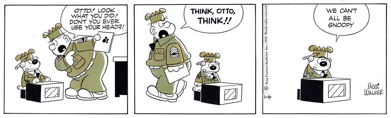 Mort and Jerry dressed Sarge’s dog Otto in a little uniform in 1969. Readers loved it, even if Snoopy was still the comics’ top dog.