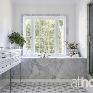 On the island and for the range backsplash, we used Calacatta Caldia, which I chose for its green undertones. The backsplash is polished, which allows more of the color to come through, and the countertop is honed and more muted. On the side counters, we used Caesarstone quartz that’s intended to mimic limestone. I love it, but contrary to popular belief, it does actually stain. My advice would be: If you’re doing a kitchen and really want marble—get it! There’s no stain-free stone, and if you find a slab that gives you an emotional experience, it’s like artwork and will make you so happy.