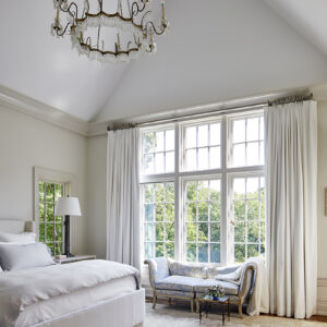 I had some fun with this room and nicknamed it “the luxe scullery” because I wanted to feel like I was cooking in an English estate! I aimed for an older feel with details like irregular Belgian bluestone floors, and I was big on concealing appliances so you could focus on my French Lacanche range. It’s a low-tech stove and oven from the oldest enamel company in France that predates the French Revolution. The cabinetry was very intentional and each set of cabinets have a different door profile. I finished my perimeter cabinets in cerused white oak, a timeless, luxurious finish that I love. The other cabinets are painted in high-gloss White Dove.