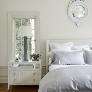 My living room. I know people love to congregate around a kitchen island, but I love drawing people into this feminine sitting room. It’s meant to be a place where you relax, connect, and just enjoy the soft lighting and adult conversation. I wanted this room to feel like you’re in Paris with the custom mantel as the focal point. It was hand chiseled in Ireland and has an organic feel. The room has paneled walls and a heavy crown moulding, which adds a little formality, and I love our gas fireplace, which evokes ambience with the flip of a switch. Other features are the sateen curtains, which have a little box pleat under the hem and hang on custom polished brass poles. They go a long way to create a luxe softness and polish in this room. The floor is a beautiful herringbone, and I layered some hide rugs on top of a larger oyster colored one, because I love tone on tone and different textures. A brass coffee table found on Chairish offers a little ’70s moment, and my Art Nouveau chandelier is from 1stDibs. It’s made of hundreds of little light milk blue glass straws hung from chains! I have a mirror collection and need to have them in every room. The one in here is églomisé—a technique of applying silver leaf to the back of glass. It’s distressed, and I love antique glass.