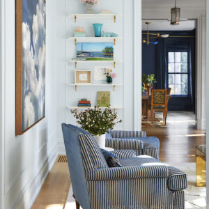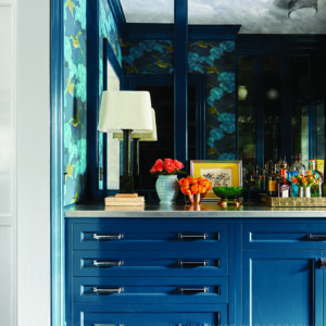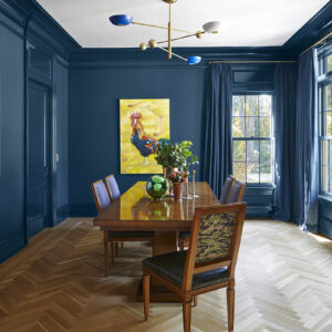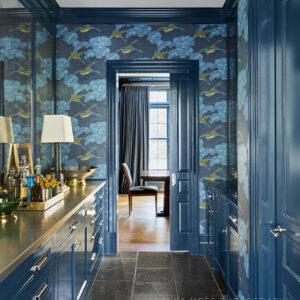 The moody Hidden Sapphire by Benjamin Moore wall color sets the tone. The table is an art deco shape, and the brass chandelier is an Italian mid-century modern style with blue accents. I covered the seats of the Louis dining chairs in bottle green leather and used two different fabrics for the chair backs and an indoor/outdoor fabric for the fronts to ward off stains. The room is grounded by exposed herringbone white oak floors and abuts the butler’s pantry, painted in the same blue color. I chose a fabulous whimsical flying duck wallpaper by Lee Jofa, and the stainless steel countertop shows years of use, which I love. Markings like this mean that you’re living and life is happening there. I found a pair of table lamps from Fairfield County Antiques and Design Center that supplements the overhead light and emits relaxation vibes. Large panels of antique glass are the perfect backdrop to this little gem of a room.