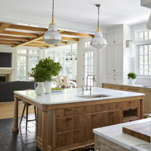 The island is birch, has a honey brown finish, and was inspired by the visual idea of a table in the middle of the room. It has detailed tapered columns, inspired by Steven Gambrel who does a lot of beautiful millwork. I love how my pendants—sourced these from High Point, NC—turned out over the island. They’re polished stainless steel, brass on top, and the bottom is frosted glass, so they look slightly industrial. They cast the perfect soft light that offers relaxing vibes.