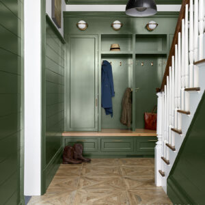 I love blues and greens. Since we have a home with several rooms, we get to have different experiences in each space. The central area towards the back of the house is painted white, so there’s plenty of serenity there. But then there are pockets of color in the living and dining rooms. I love being surrounded by beautiful color, and I pored over tons of samples to get the right shades for these spaces. In the living room, we added white to Benjamin Moore’s Cumulus Cloud to make it more powdery and set a soft tone. Our mudroom is an olive green, which we made more dramatic by painting all the trim and shiplap in the same green. Above that, the wall and staircase is white to balance everything out. In my husband’s office, he has two blue bookcases to balance out white walls, so overall I feel like there’s a good mix of nice clean white rooms and colorful zones.