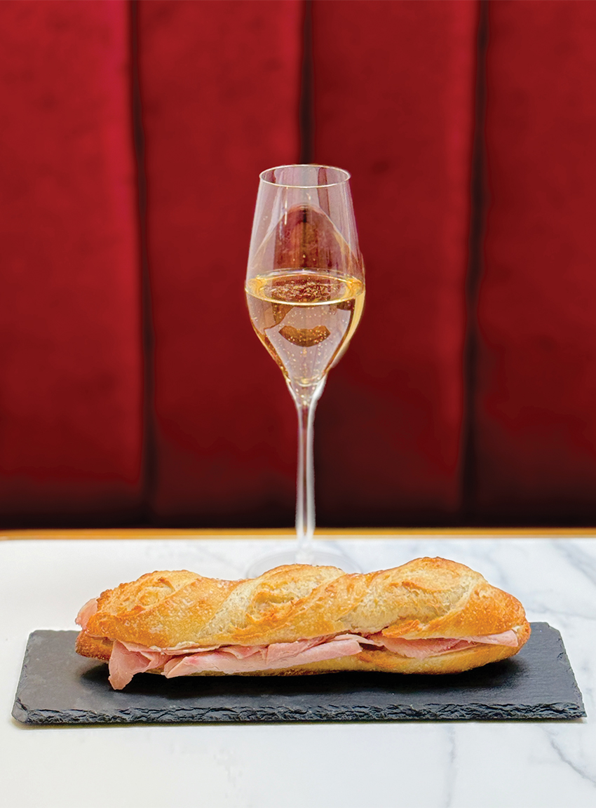 Up a few stairs, you’ll discover a jewel-box room lined with red banquettes and mirrored walls accented with little gold medallions, creating an inviting space where guests can linger at square bistro tables that easily rearrange for groups of varying sizes. Menus on the table offer French cheese from Murray’s Cheese in New York City and charcuterie, as well as champagne and wines. This sophisticated space is also where Saisons Sucrées serves a luxurious high tea, with a selection of organic black, green and herbal Palais de Thé teas and Italian Aneri coffee (made from wood-fire roasted beans). Tiered towers of bite-sized French pastries, savory and sweet, look too magical to eat. Almost.