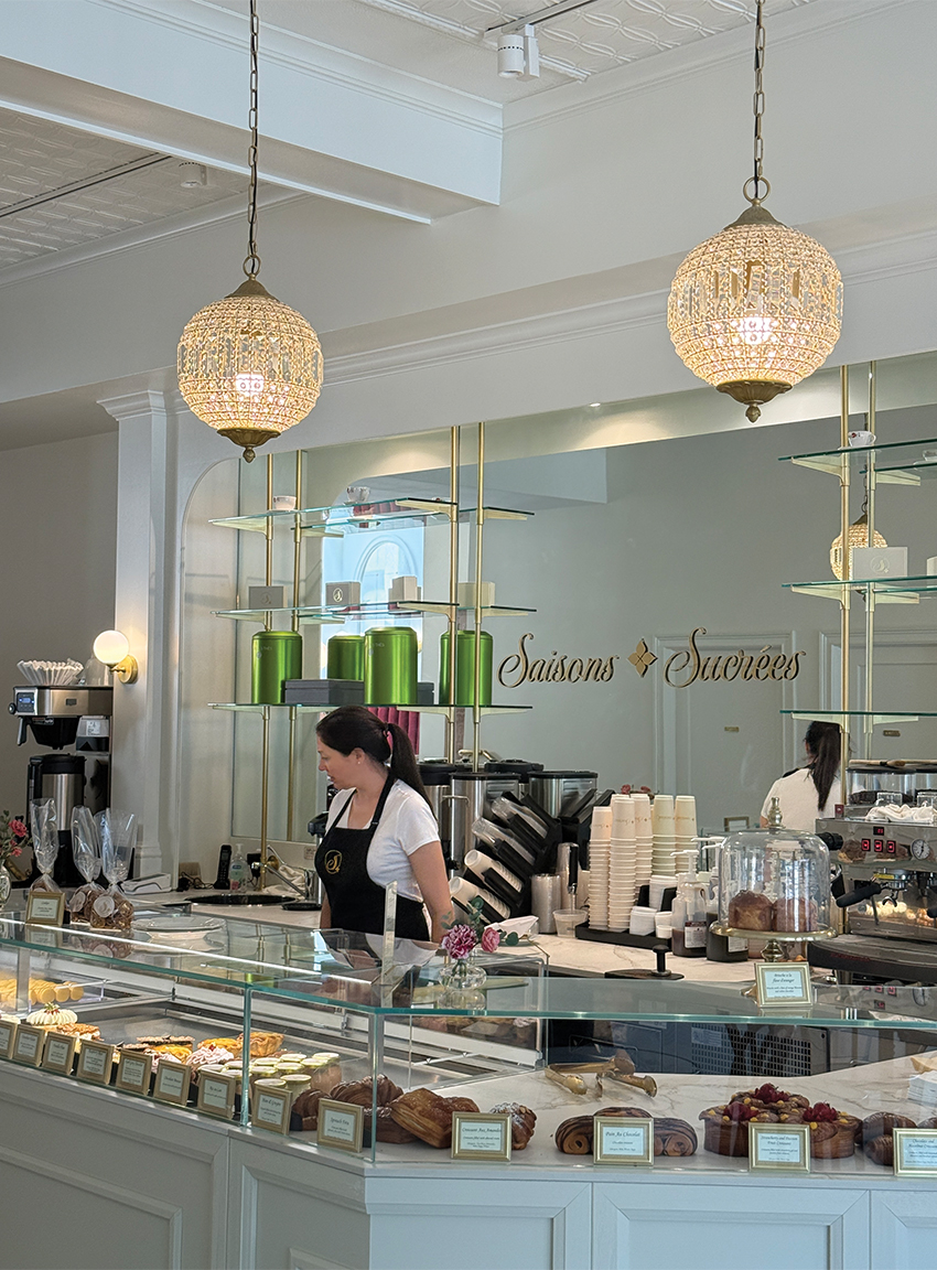 French flag flies among the Stars and Stripes that line Main Street in New Canaan, heralding the arrival of Saisons Sucrées. The elegant little patisserie transports us to Paris, with its black-and-white marble floors and warm white walls adorned with large black-and-white photographs of the City of Light. Charming little round café tables and simple bistro chairs give a streamlined look.