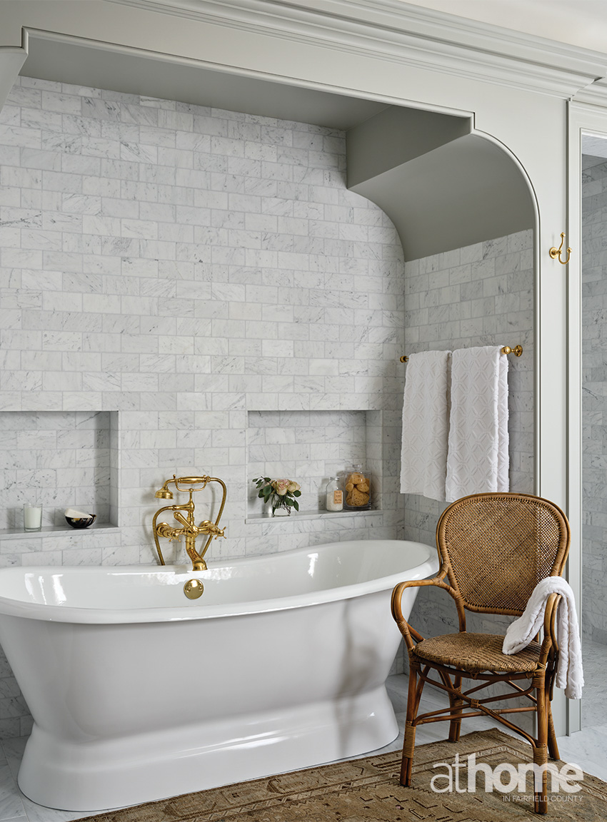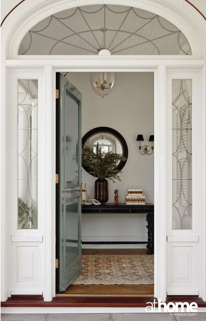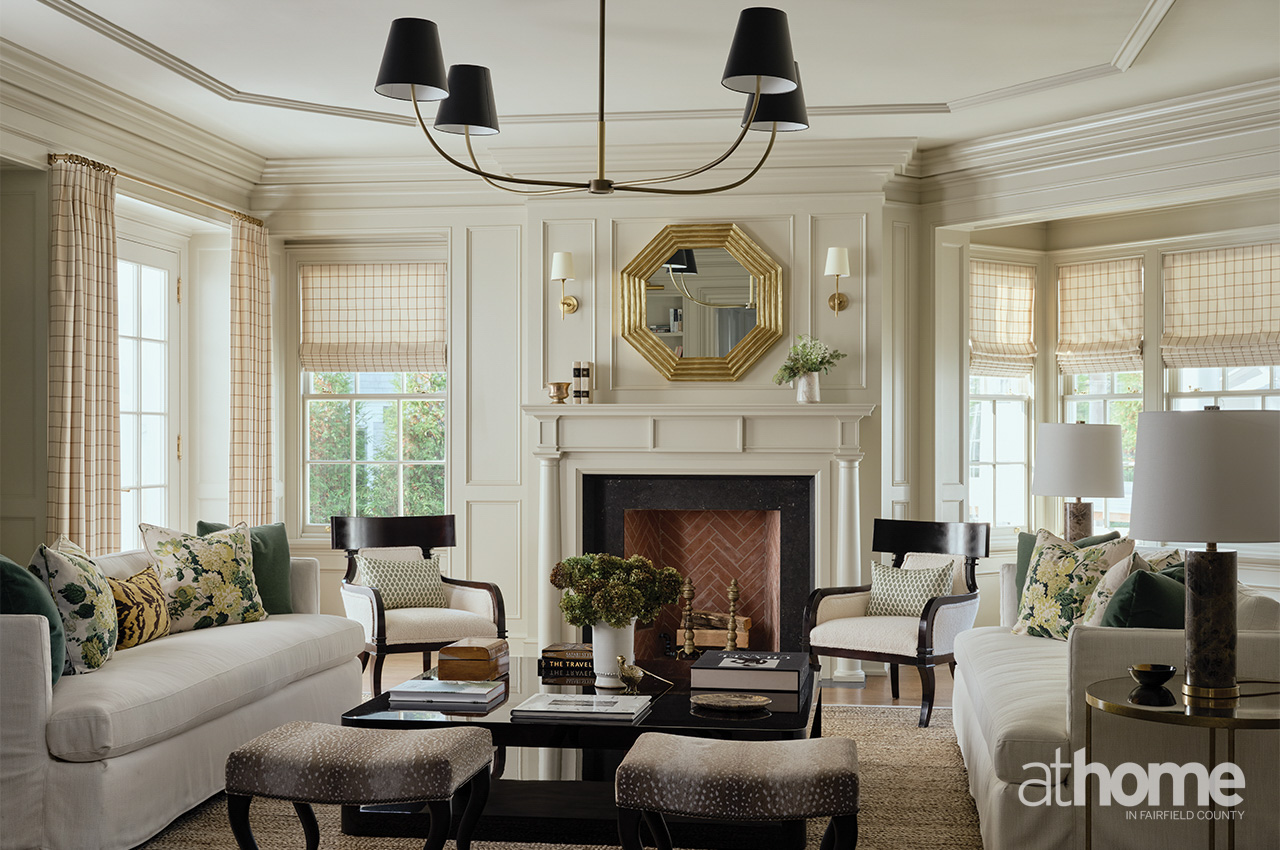 above: Classic millwork meets modern lines in this multi-room space, where arched openings and crisp furnishings strike a timeless balance.