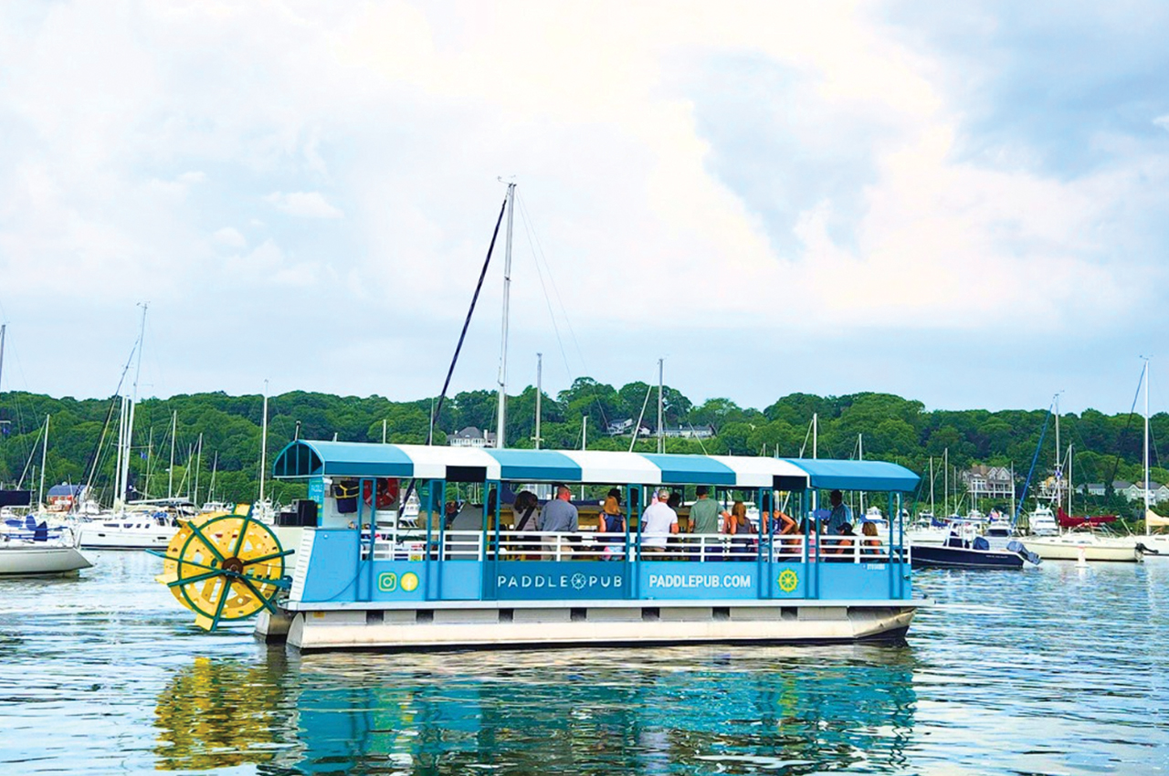 This pedal-powered party boat has room for 22 guests beneath a blue canopy on an open-air deck. There are 12 pedal stations at the bar, and pedaling is easy through the calm waters (and no worries, the boat has a motor system). Captain and the First Mate steer the paddle wheel through a 90-minute cruise to the outer reach of Stamford Harbor. It’s BYO—bottles of water, beverages in cans and food. You can bring your own playlist to plug into the Bluetooth sound system. And yes, there’s an on-board bathroom (“head,” in nautical terms. paddlepub.com