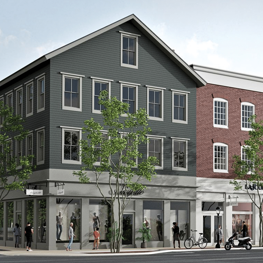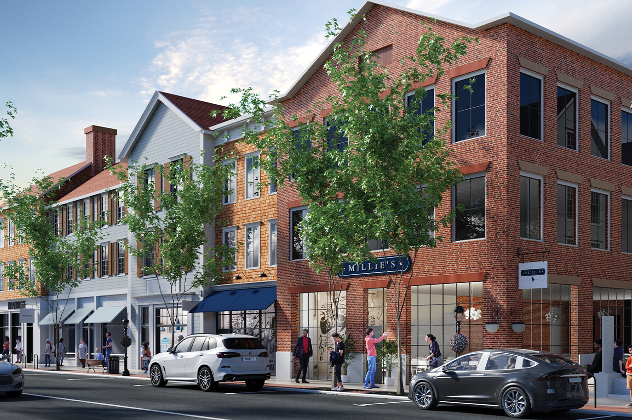 This rendering shows the front of Millie’s on the Post Road, with Framebridge located on the corner of Corbin Drive.