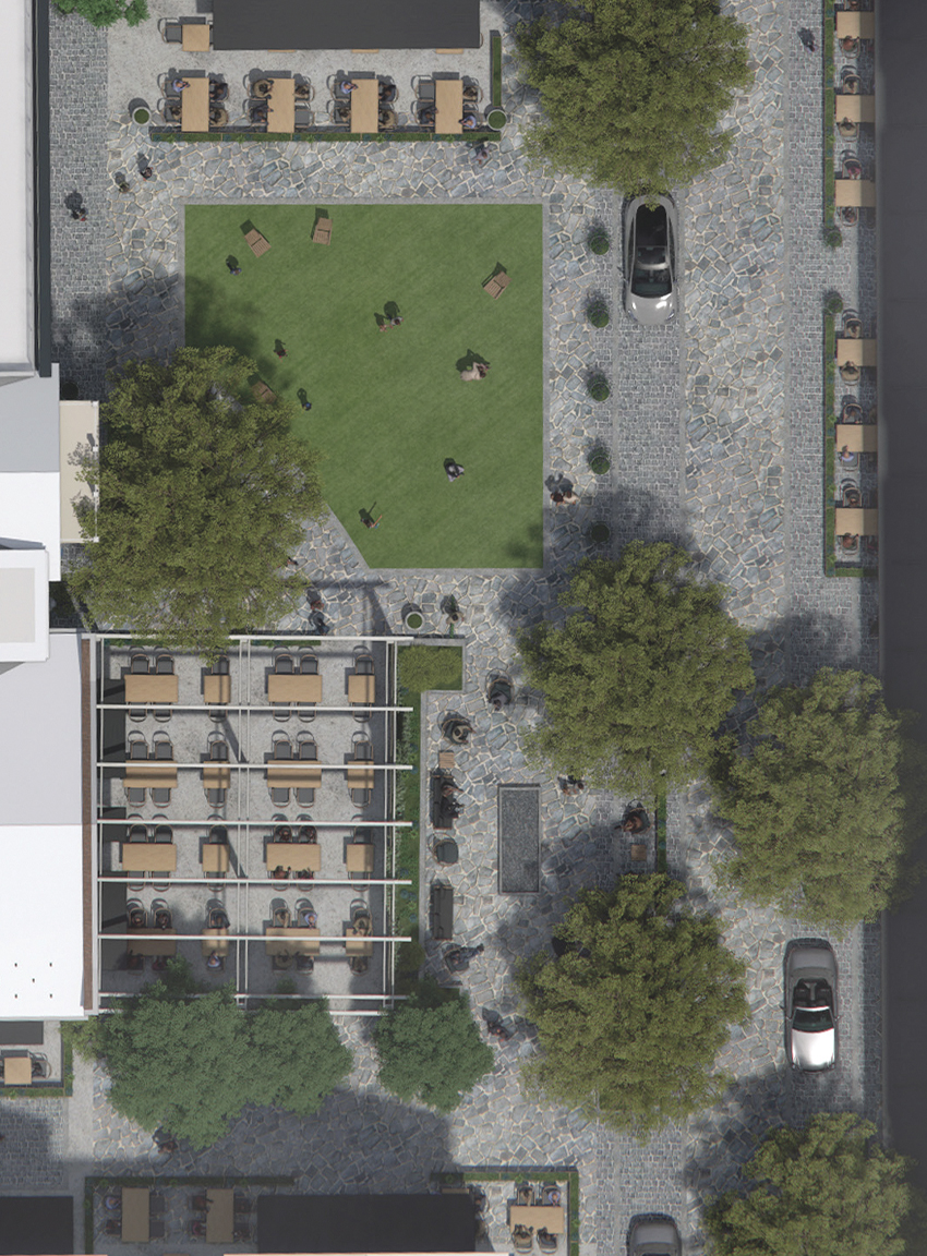 Special attention has been given to outdoor plazas and green spaces, collectively referred to as the project’s “public realm.” Working with Of Place, a national firm specializing in public realm design and placemaking, the team carefully reimagined every element—from landscaping and tree placement to stonework, seating and pedestrian flow—while overcoming technical challenges such as the limited soil depth above the underground garage. The intention was to create spaces that feel natural, lived-in and flexible—not staged or overly designed.