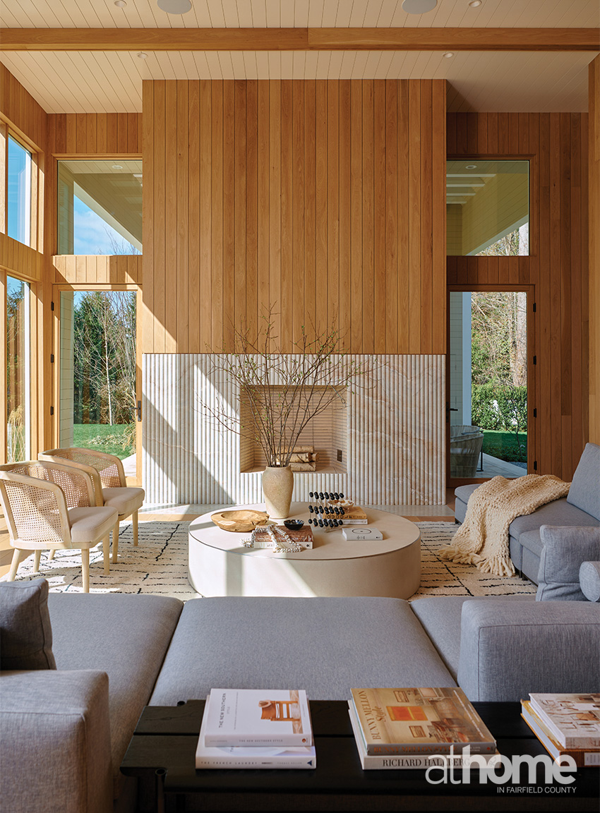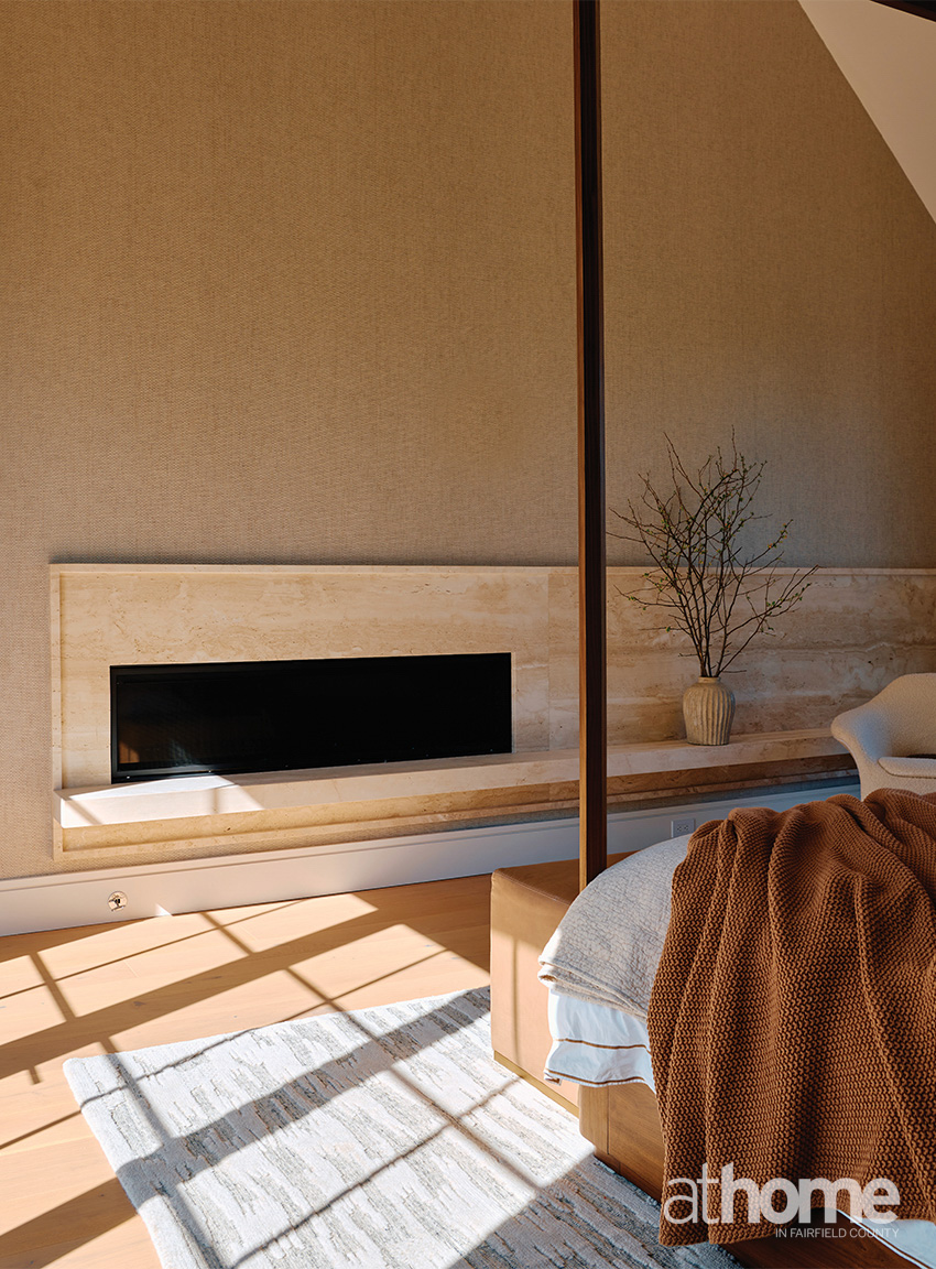 I think the fireplace in the living room is incredible. You can’t even see in the photos how cool it is, because the stone wraps around the sides. The front is all one gigantic piece from a full slab. And I did this little reveal edge in the top so that you can tell that it’s one. You can see that there’s no division. It’s really unique, and the texture of it is amazing. There’s this rawness to it, especially against the white oak wood, which is very warm. It’s just really soothing. It’s like your eyes are rewarded with the wood, and then you see the vertical lines and the fluting on the hearth stone.
