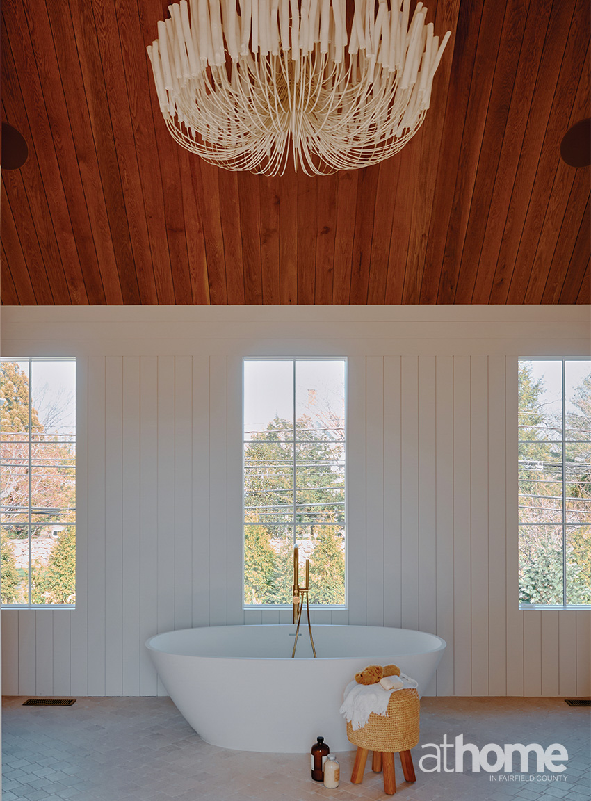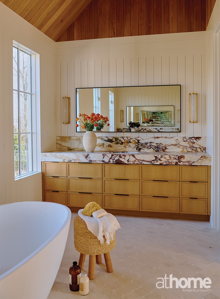 I also love the primary bathroom. The photos don’t do it enough justice, but I played off the height of the room with the white section where the wood starts.The ceiling height was high, but it wasn’t a perfect symmetrical vault because of the shower. So, I had to play with a weird ceiling. I was proud of how it came around and really proud of how it mixed together the elements.
