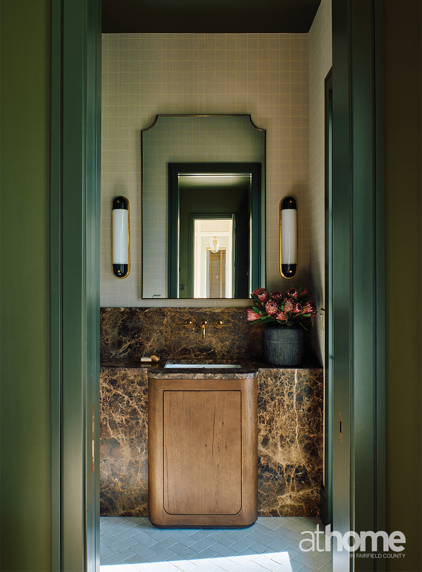 It’s off of a study that’s entirely that color. It’s dark and moody and also plays off of some equestrian vibes. Originally, I wanted to do a curved vanity in marble, but that was quite expensive. So instead, I bought a vanity that was already curved, and then I built the surround with marble. It really played well with the Holland & Sherry plaid wallpaper, which is linen. I think it really works.