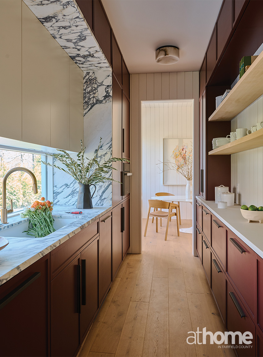 You’re kind of compressed, because the entry is not gigantic, but then you walk down the hallway and arrive at the stairwell. It’s all glass and connects the structures, and there’s this ‘wow’ moment before entering the kitchen, where the marble is just amazing.