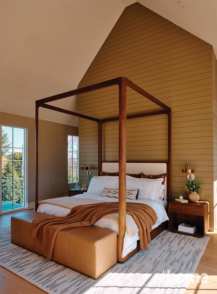 above: Soaring Loewen glass windows and warm vertical wood wrap a low-slung living room built for views and lounging on the B&B Italia sofa. A perfectly placed Noir bench extends the sectional’s silhouette, with a Ben Soleimani rug adding soft texture below.