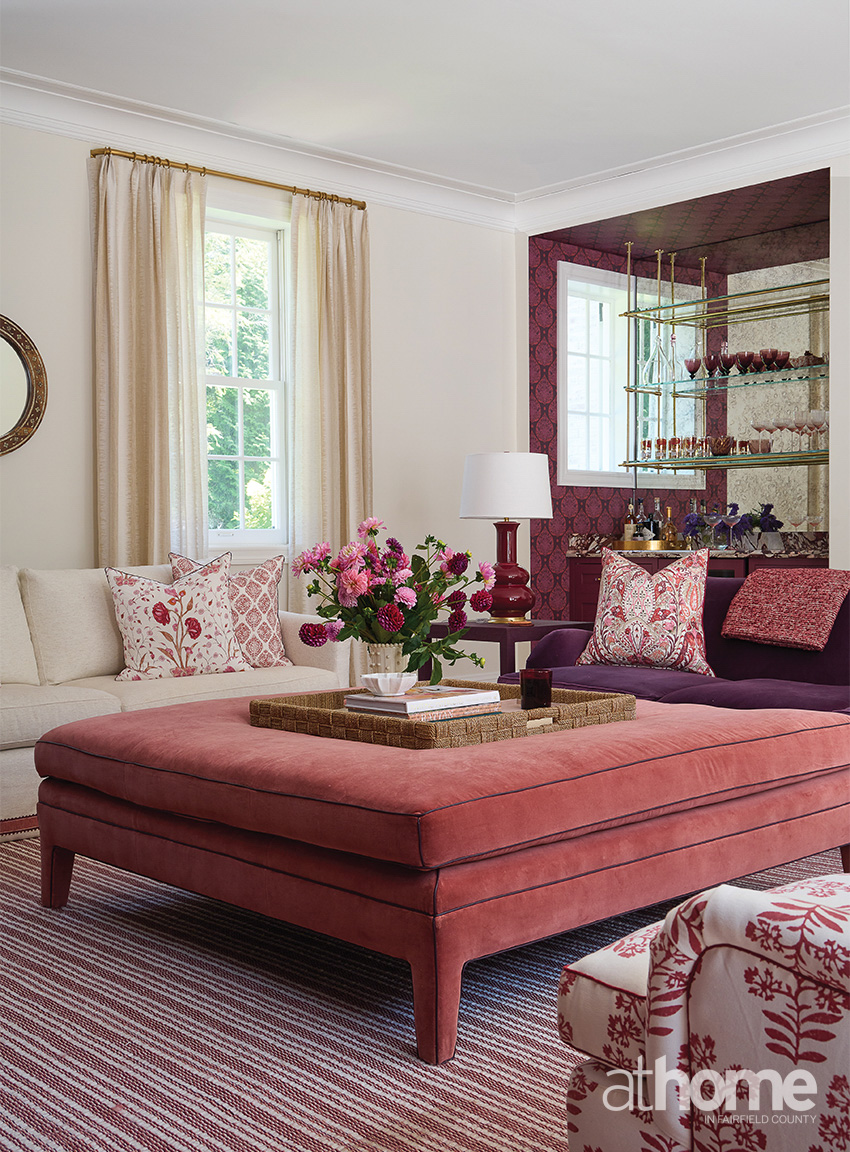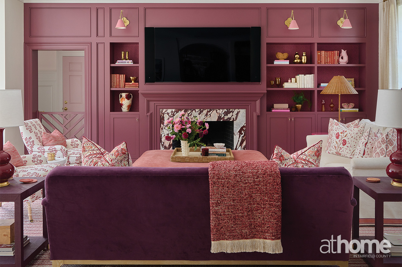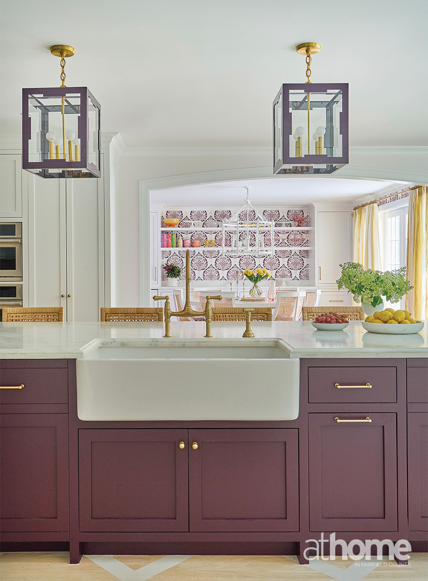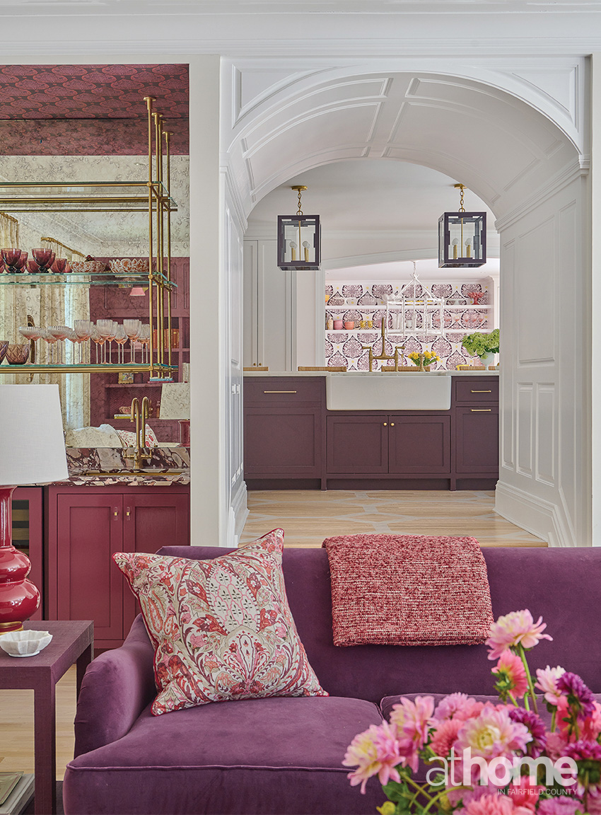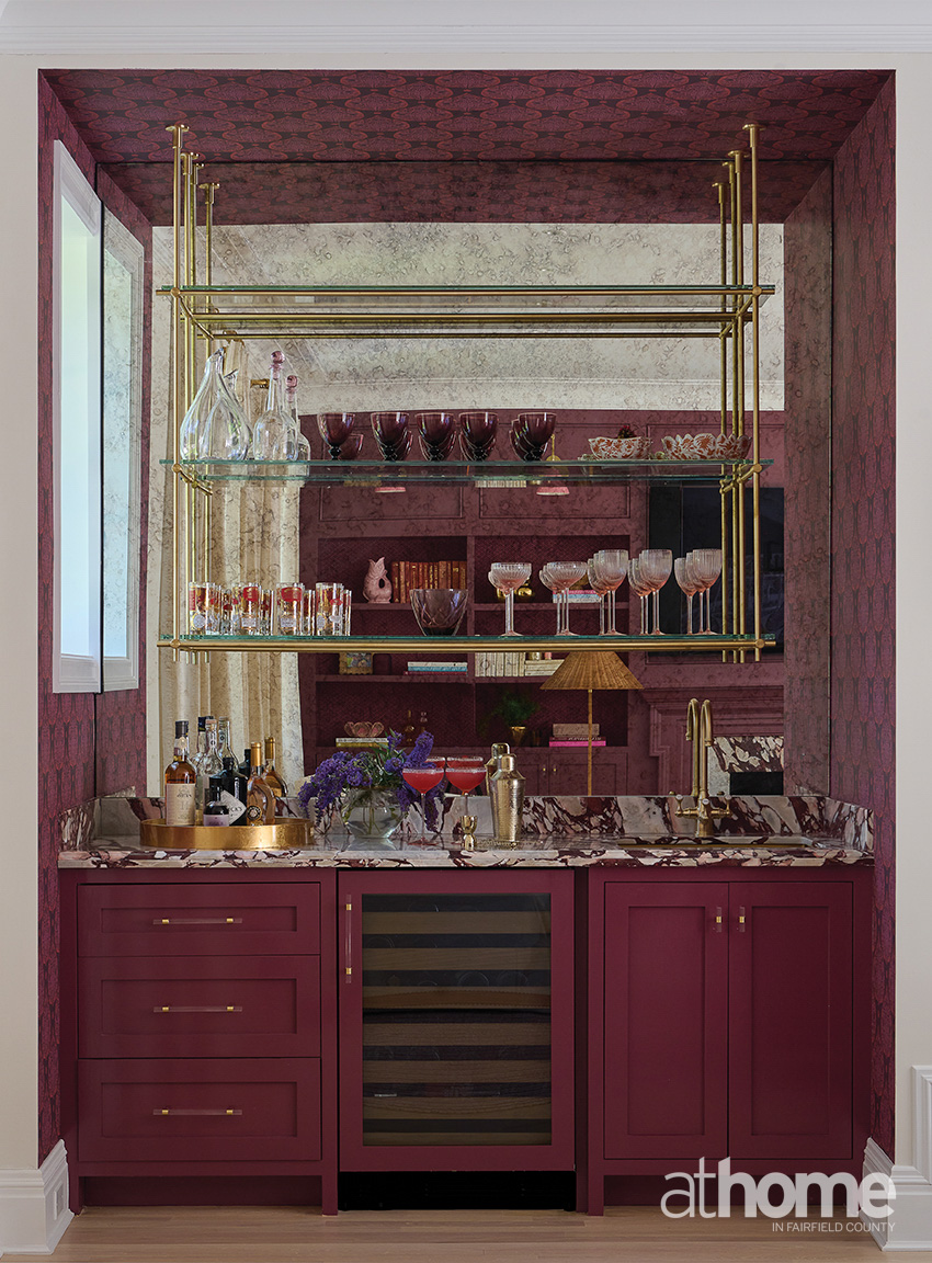 I really think that the family room is pretty divine, because it’s moody and it’s just layered and comfy. I have to say that’s probably my favorite. The color is called Adventurer by Little Greene, and it’s a cross between maroon and eggplant, a grapey tone. I love the Hwang Bishop sconces over the bookshelves, which are backed with custom-colored Galbraith & Paul paper. And then there’s the wet bar with the Calacatta Viola marble.