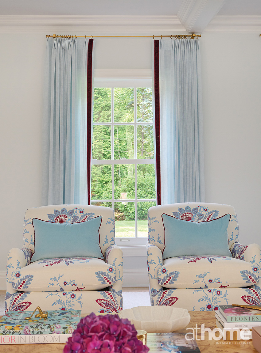 The living room also came together really well, and it was the closest to her original vision. It’s where we were able to bring in the blues, and I love that kind of claret with the brighter blue.