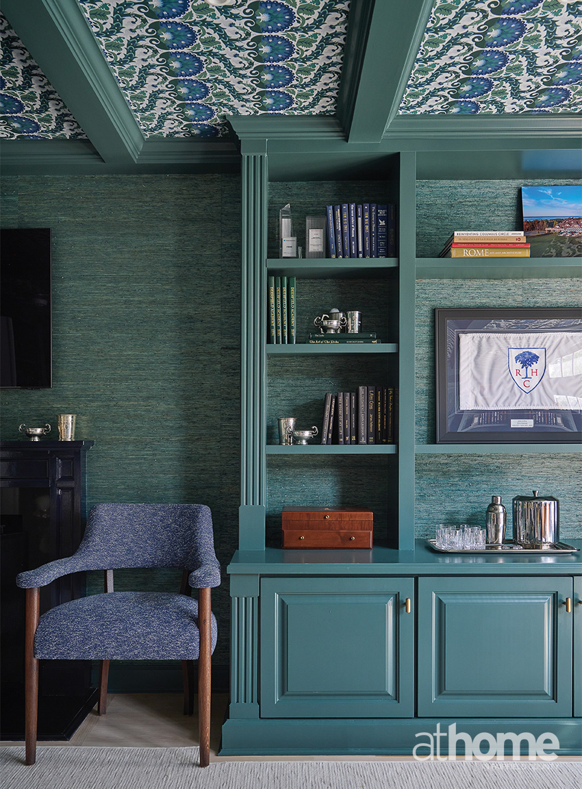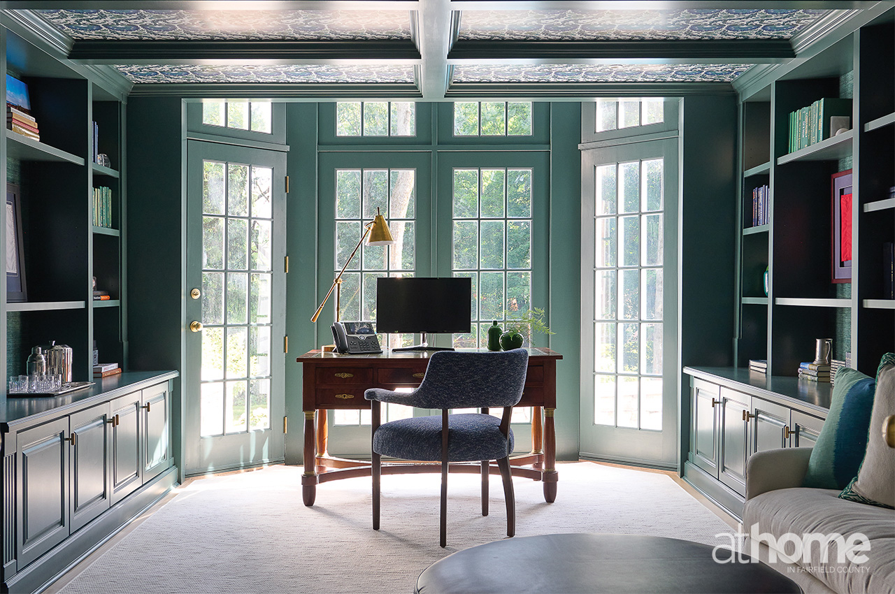 He loves green. So, we landed on a combination of greens and navy. That was an existing office, and we added the coffer detail and then the wallpaper and paint. We did a green grasscloth from Phillip Jeffries on the wall, and then we did the ZAK + FOX on the ceiling, which is where we pulled the palette for the room.