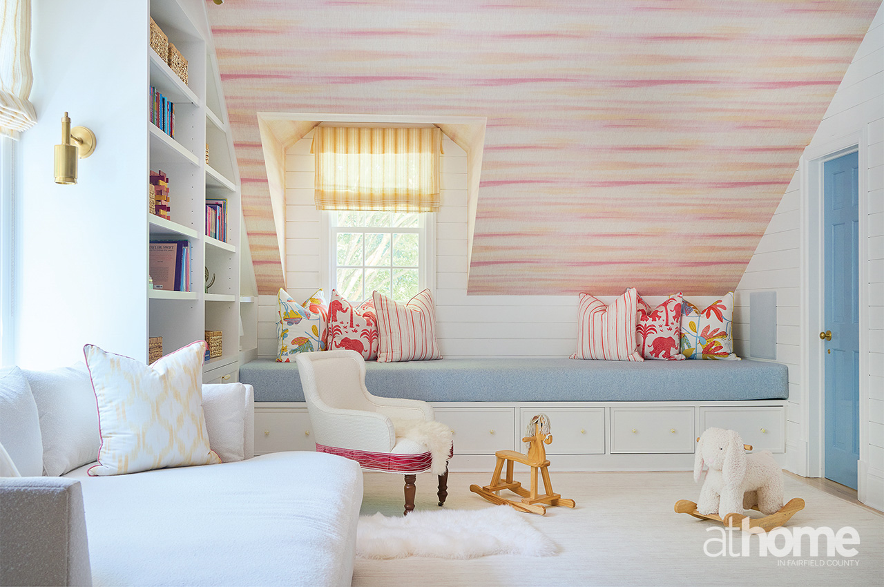 The addition of the mudroom meant that we were able to expand the playroom on the second floor. We knew that she really wanted yellow, and then we added some blue and pink in there, too. I immediately thought of this Thibaut line for the wallpaper and some pillows. We did a custom penny tile on the bathroom floor, which was super cute.