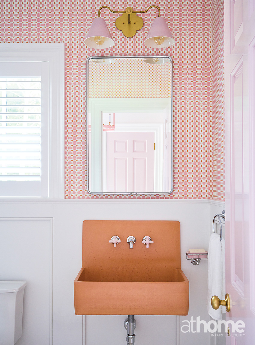 Yes, the formal powder room has a pink sink. The one off the mudroom has an orange sink with porcelain pink handles and a pink shower.