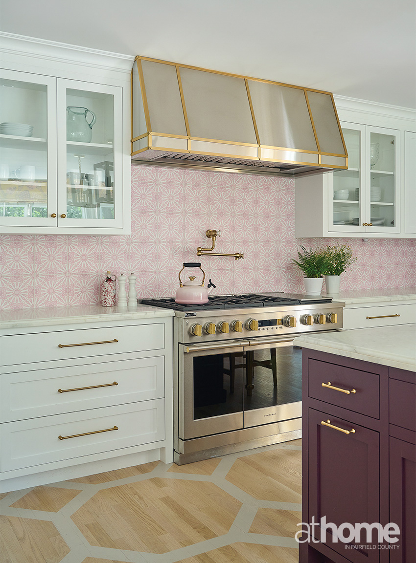 I think the biggest thing was finding something special for the backsplash. That was a big challenge. We did a marble backsplash with a custom color, which was pretty special. Then we added a custom hood, bringing the brass in. The walls are the most subtle shade of pink.