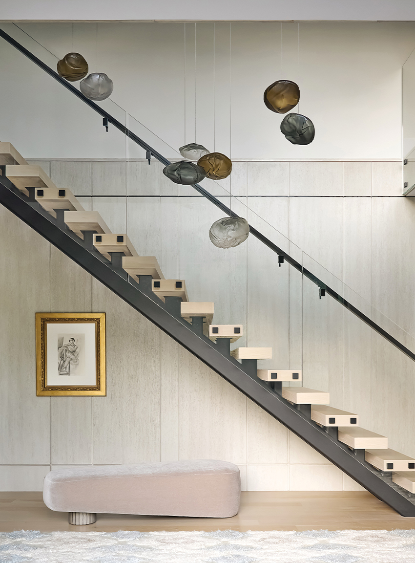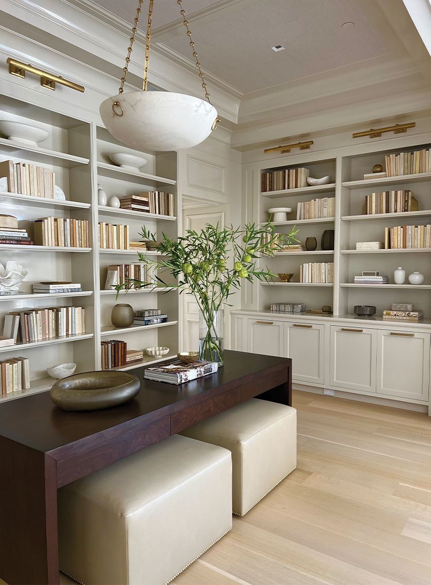 “Just having different artwork in a space drastically changes the look and the feel,” she says. “You could have a caramel suede throw pillow on an ivory sofa to make it more inviting. Maybe heavy fringe. That can add a lot of depth and softness. Or what I love to do is search the globe for decorative smalls that really make an environment, like a beautiful bowl from the South of France that nobody else has, and you put it on your coffee table. Things like that—they really have provenance, and when you walk into a room and sit down, that could be a conversation. You talk about travel or the arts. There’s a lot that goes into every single light fixture. Individual things can be very special.”